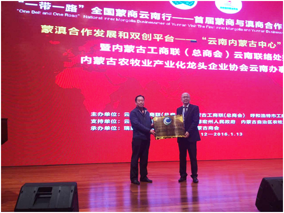論壇上,蒙滇合作發(fā)展和雙創(chuàng)平臺——“云南內(nèi)蒙古中心”建設(shè)啟動儀式暨內(nèi)蒙古工商聯(lián)(總商會)云南聯(lián)絡(luò)處授牌、內(nèi)蒙古農(nóng)牧業(yè)產(chǎn)業(yè)化龍頭企業(yè)協(xié)會云南辦事處授牌儀式同期舉行。內(nèi)蒙古農(nóng)牧業(yè)廳黨組成員、總農(nóng)藝師王雨峰授予云南省內(nèi)蒙古商會“內(nèi)蒙古農(nóng)牧業(yè)產(chǎn)業(yè)化龍頭企業(yè)協(xié)會云南辦事處”的牌匾,內(nèi)蒙古農(nóng)牧業(yè)產(chǎn)業(yè)化龍頭企業(yè)協(xié)會執(zhí)行會長林永亮宣讀辦事處成立文件,由云南省內(nèi)蒙古商會會長徐國林擔(dān)任辦事處主任。