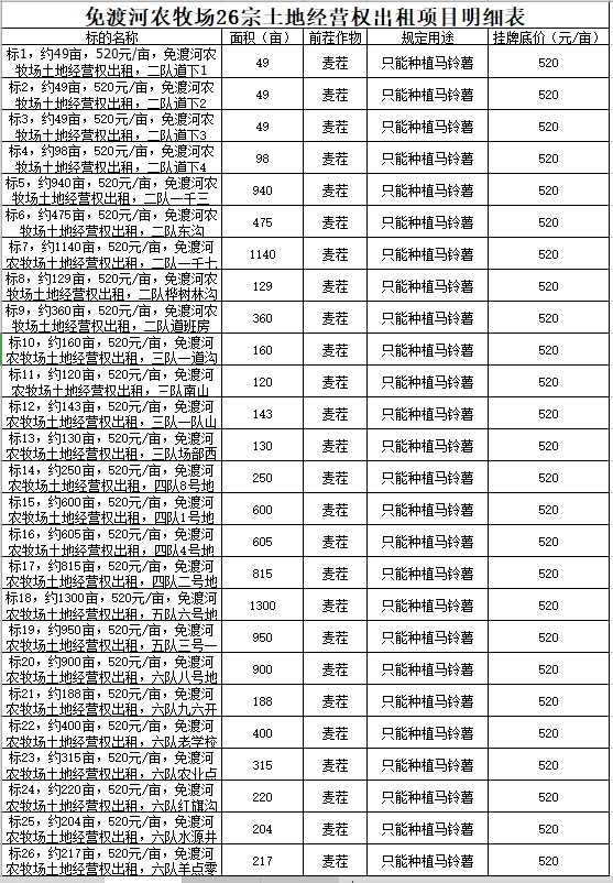 7.掛牌價(jià):見(jiàn)明細(xì)表(掛牌價(jià)為每畝耕地應(yīng)當(dāng)支付的租賃底價(jià))