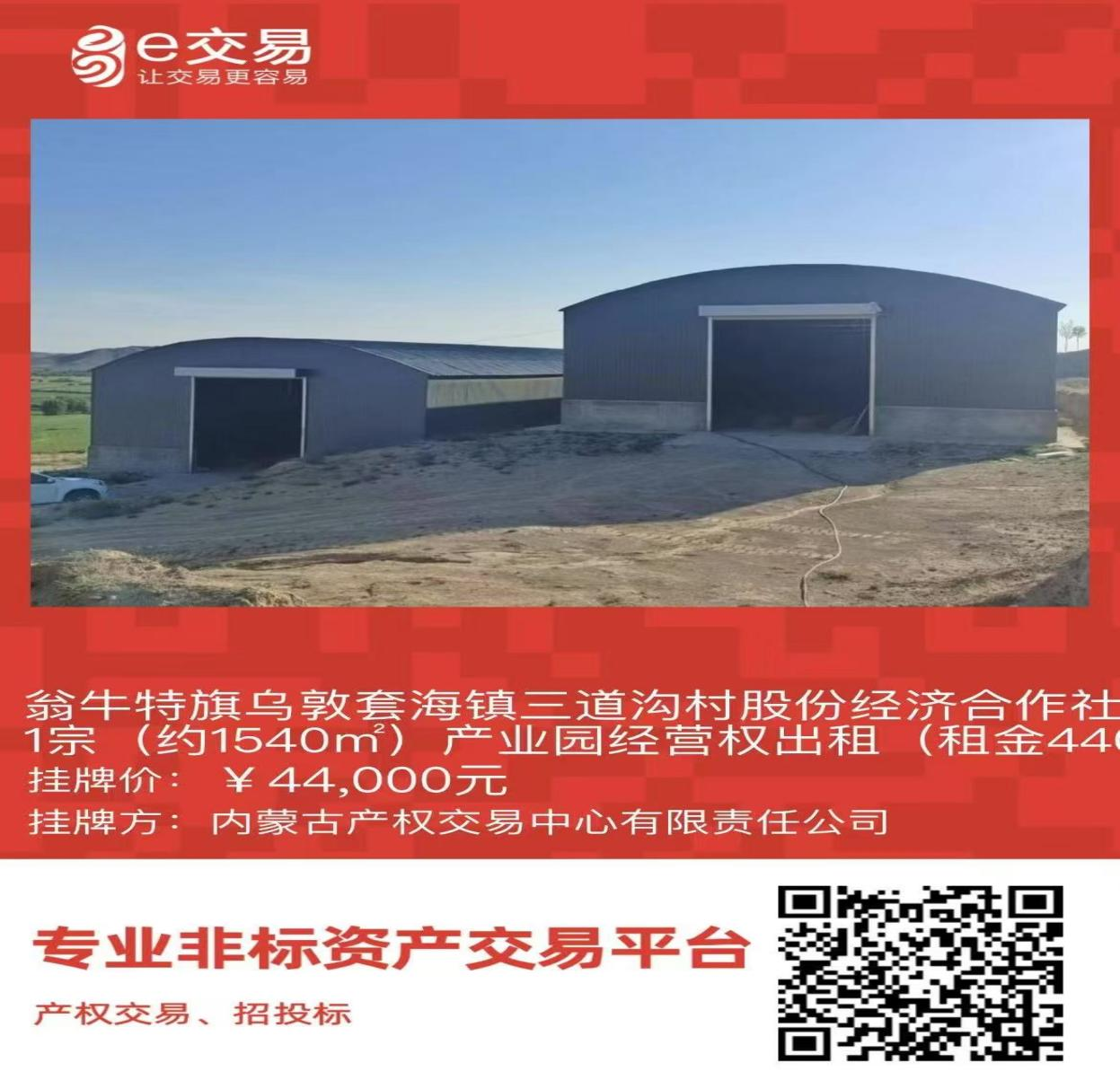 翁牛特旗烏敦套海鎮(zhèn)三道溝村股份經(jīng)濟(jì)合作社1宗(約1540㎡)產(chǎn)業(yè)園經(jīng)營(yíng)權(quán)出租(租金44000元/年,租期5年)