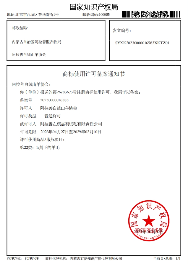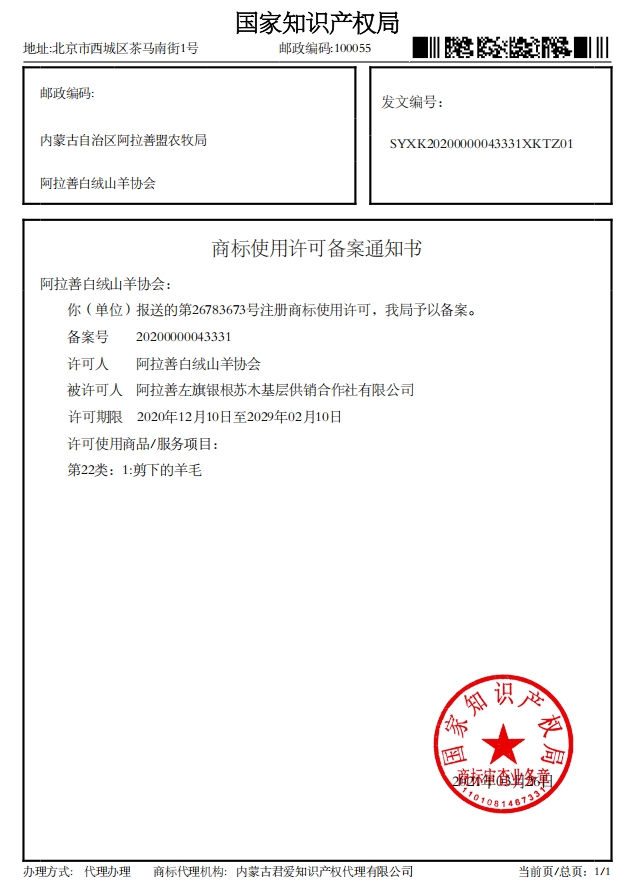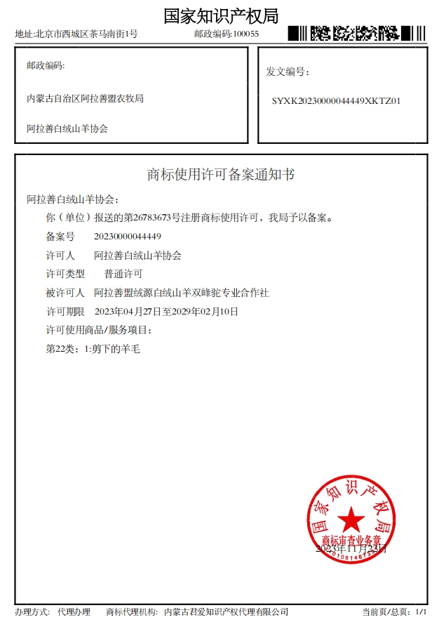 阿拉善白絨山羊協(xié)會已收到國家知識產(chǎn)權(quán)局下發(fā)的4項(xiàng)商標(biāo)使用許可備案通知書