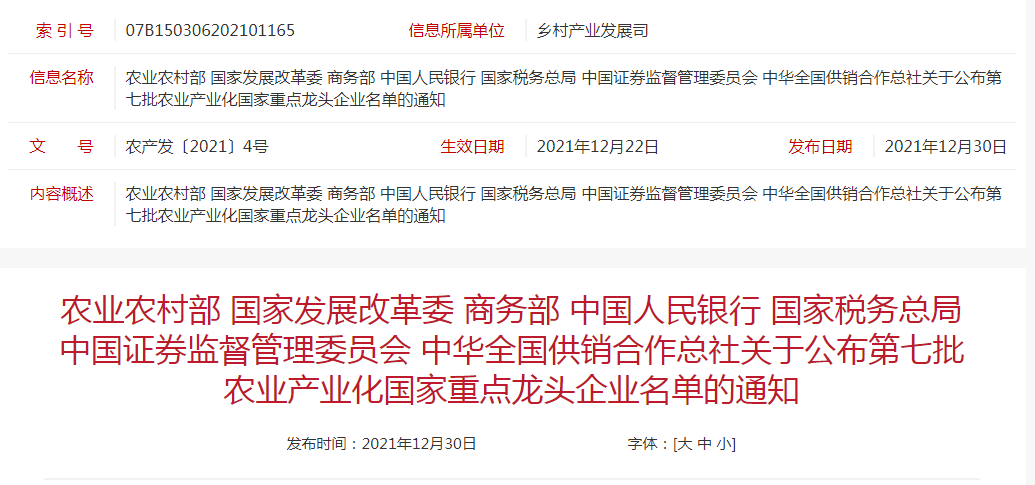 企業(yè)名稱(chēng):農(nóng)業(yè)農(nóng)村部 國(guó)家發(fā)展改革委 商務(wù)部 中國(guó)人民銀行 國(guó)家稅務(wù)總局 中國(guó)證券監(jiān)督管理委員會(huì) 中華全國(guó)供銷(xiāo)合作總社關(guān)于公布第七批農(nóng)業(yè)產(chǎn)業(yè)化國(guó)家重點(diǎn)龍頭企業(yè)名單的通知